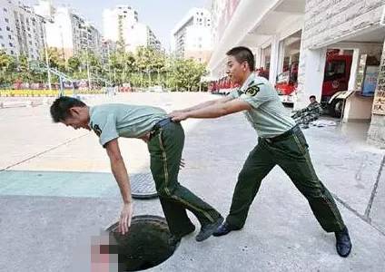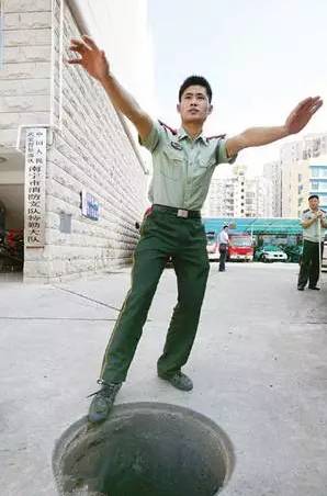 ①双臂向前伸展,在水中行走时,重心放在后脚上,前脚伸出,用脚尖左右扫动,确认前方是平地,双脚交替探路前进。如果还是踩空,身体在下坠时,两只伸开的手臂可以架在井口,防止身体被深井吸入。
