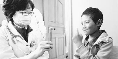 参与“2016年光彩·西藏和四省藏区母婴健康行动”的北京大学第三医院儿科副主任医师汤亚南(左),在索县人民医院为藏童义诊。潘松刚摄
