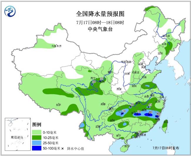 今晨,中央气象台继续发布暴雨蓝色预警和强对流天气蓝色预警:未来24小时,湖南西北部和东部、江西中部、福建北部、贵州东北部以及云南西部、广东南部沿海等地的部分地区有大雨或暴雨。