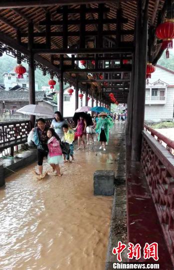 记者从网友发布的视频和图片中看到,景区内不少木制房屋被洪水冲垮;游客打着雨伞在风雨桥上踏水而行,正在迅速撤离。
