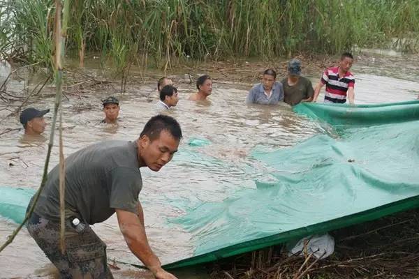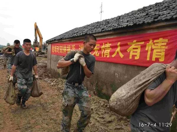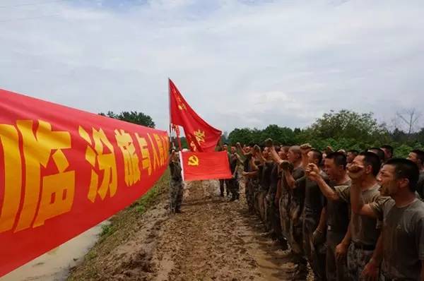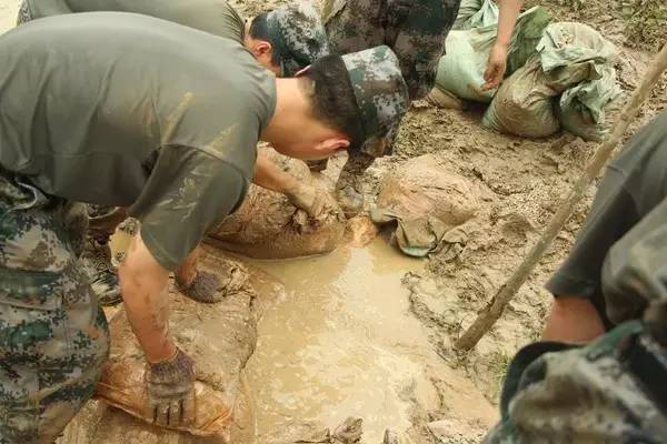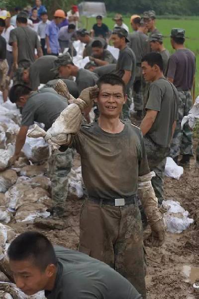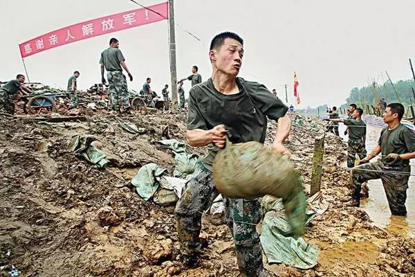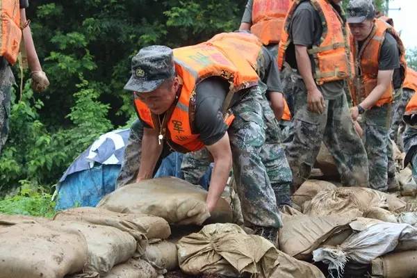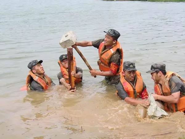 扛沙包、搭人墙,官兵们义无反顾;涉深水、下险滩,官兵们迎难而上;迎风雨、斗洪魔,官兵们无所畏惧。抗洪一线,处处都是官兵们忙碌的身影和坚毅的脸庞。为了处置一处处管涌险情,官兵们前赴后继奋不顾身地跃入水中,英勇无畏地与洪水搏斗。