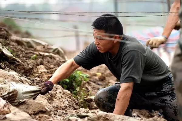 天降暴雨,泥泞的道路上官兵们一字排开,用手臂搭建沙土“传送带”。他们无视浑浊腥臭的泥水,以“不怕苦、不怕累”的顽强精神誓与洪魔作斗争,全力消除险情,确保大堤安全。满身的泥巴,遮盖不住他们的帅气,那是军人信仰的光芒。