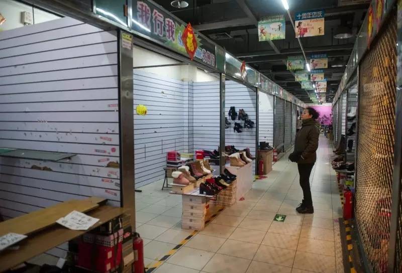 2015年1月12日,北京“动批”天皓成服装批发市场摘牌撤离。一名等候退还押金的商户在已经显得空荡的天皓成服装批发市场内等候顾客。新华社记者罗晓光摄