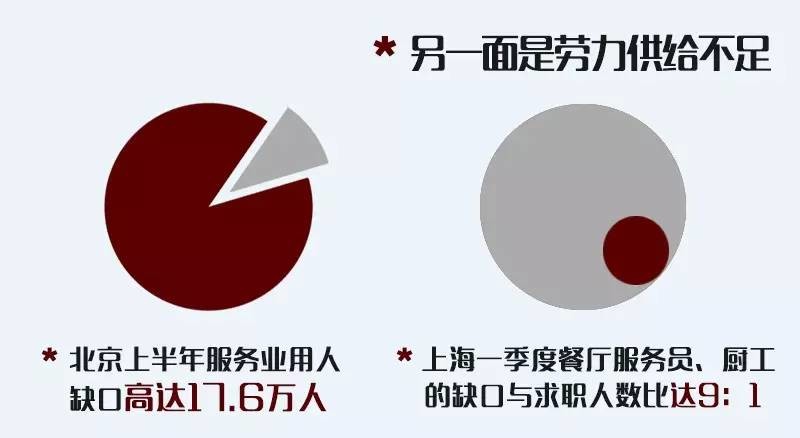 今年4月北京市职业介绍服务中心发布的“2016年上半年北京市人力资源市场供求形势分析”显示,北京市上半年服务业用人缺口高达17.6万人。而中国人力资源市场信息监测中心公布的数据也显示,上海市今年一季度餐厅服务员、厨工的岗位缺口与求职人数比高达9:1。