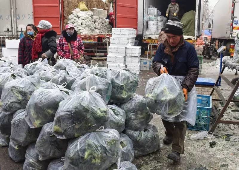 2016年1月21日,几位菜商在北京新发地农产品批发市场分装蔬菜。 新华社记者罗晓光摄