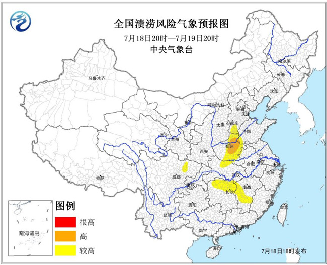 受持续降雨的影响,预计7月18日20时至7月19日20时,河北南部、河南中东部、山东西部、安徽西北部、湖北北部、湖南北部、江西中西部和四川盆地北部等地发生渍涝的风险等级较高,其中,河南中北部、山东西部的部分地区发生渍涝的风险等级高,易形成城市内涝和农田渍害,需加强防范。