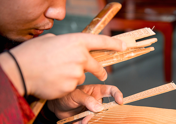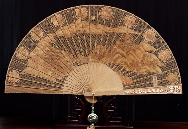 拉花——用钢丝锯在薄薄的扇片上,用手工拉出上万个大小不等,形状各异的孔眼,在整个扇面上组成千变万化,虚实相等的各种精美图案。