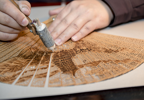 烫花——又叫烙画,是用火笔在扇面上烫出深浅不一,褐色焦痕的图案。技艺人员巧妙利用檀香自然木纹,勾勒出奇峰异山,云依雾绕,传神入化。