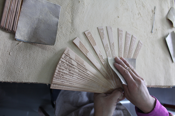 打磨——用纸砂皮对扇骨上的毛糙处进行手工打磨,使其细腻光滑。