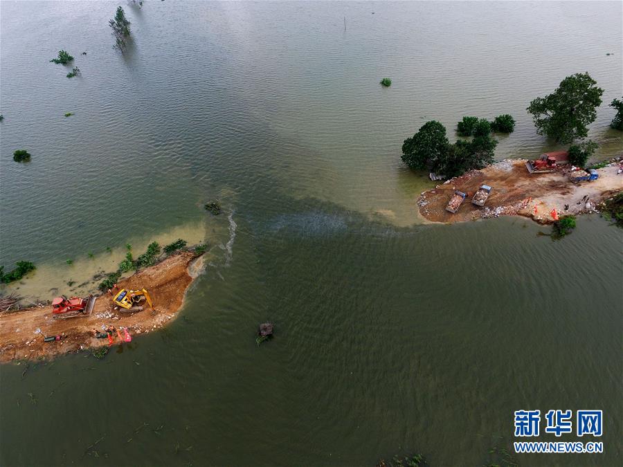 7月17日凌晨3时左右,湖北黄梅县濯港镇丁字街村考田河堤坝突现溃口,并不断扩大。截至18日上午,溃口长度被控制在80米以内。目前,武警水电部队官兵正逐步开展溃口封堵工作,预计5天左右完成。此次溃口已导致1.5万亩农田、精养鱼池淹没,9个村(场)16881人受灾,5666名受灾群众被集中转移安置。 新华社发(熊琦 摄)