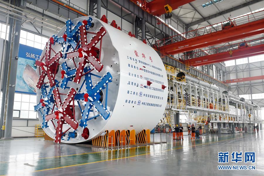 记者从中国中铁工程装备集团有限公司获悉,全球首台“马蹄形”刀盘盾构机7月17日正式组装调试完毕。设备的成功研制标志着我国已经拥有具有自主知识产权的超大断面马蹄形盾构设计和施工技术,实现了异形盾构装备的自主化和智能化,为我国高端设备进军国际市场提供了强有力的工程示范。据介绍,该盾构机专门为蒙华铁路白城隧道量身定做,将首次应用于铁路山岭软土隧道领域。刀盘呈倒“U”形,远观形似马蹄,刀盘采用九个小刀盘共同组成一个马蹄形断面的创新组合方式,可进行全断面切削。新华社记者 李博 摄