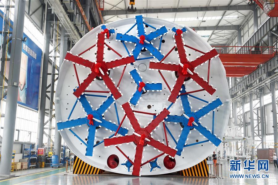 记者从中国中铁工程装备集团有限公司获悉,全球首台“马蹄形”刀盘盾构机7月17日正式组装调试完毕。设备的成功研制标志着我国已经拥有具有自主知识产权的超大断面马蹄形盾构设计和施工技术,实现了异形盾构装备的自主化和智能化,为我国高端设备进军国际市场提供了强有力的工程示范。据介绍,该盾构机专门为蒙华铁路白城隧道量身定做,将首次应用于铁路山岭软土隧道领域。刀盘呈倒“U”形,远观形似马蹄,刀盘采用九个小刀盘共同组成一个马蹄形断面的创新组合方式,可进行全断面切削。新华社记者 李博 摄