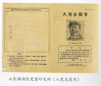 从志愿书的封面上,可以清楚地看到,在党的领袖毛主席画像下面,赫然印着入党誓词:“志愿加入中国共产党的组织,服从党纲党章,执行党的决议......”(参见白建国、白婧:《红色珍藏》,240-241.)