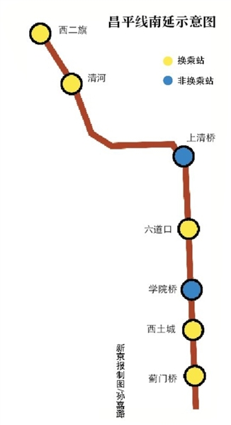 而昌平线南延可使得昌平线与其他线路接驳,分散客流。从西二旗到蓟门桥,中途会经过清河、上清桥、六道口、学院桥、西土城等地,附近15号线、10号线以及在建的12号线都可以进行换乘。