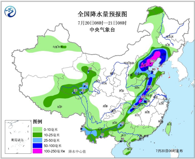 预计,20日08时至21日08时,湖南北部、湖北中东部、河南东南部、安徽西北部、江苏西北部、山东中部、河北中东部、北京、天津、辽宁中南部及云南西部、广西南部沿海等地有暴雨,其中,河北东北部、辽宁西南部、北京中南部、天津北部以及湖北中部偏北、河南东南部、安徽西北部等地的部分地区有大暴雨(100~240毫米);上述地区局地并伴有短时强降水、雷暴大风等强对流天气,最大小时雨强50~70毫米,局地可超过80毫米。