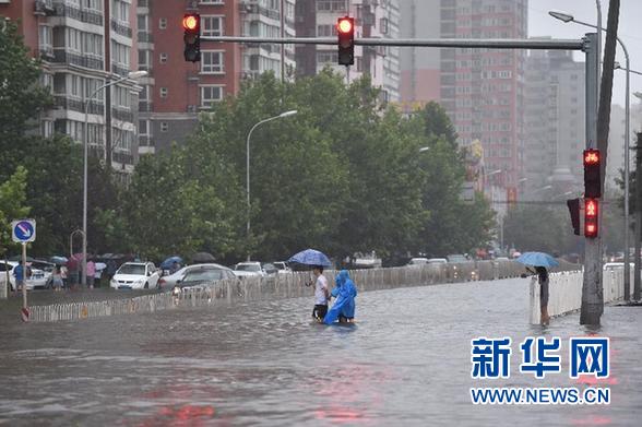 7月20日,行人在北京地铁角门西站附近的积水路段涉水前行。新华社记者 李鑫 摄
