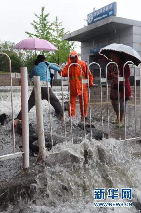 7月20日,北京地铁10号线莲花桥站D口外,北京排水集团的工作人员帮助行人跨过急水区。新华社记者 罗晓光 摄