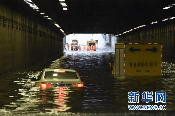 7月20日,工作人员在北京西站北广场前主路隧道排险救援。新华社记者 武巍 摄