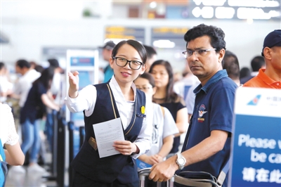 南航地服工作人员指引旅客办理登机手续
