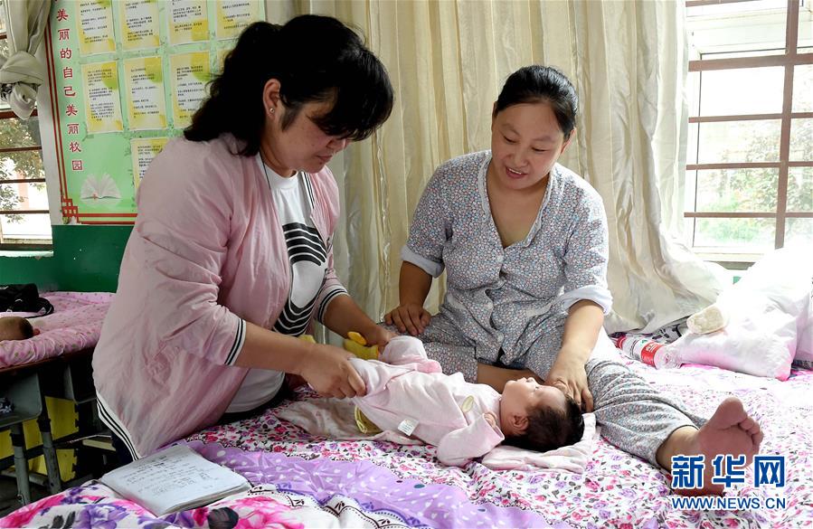 7月20日,安阳市韩陵镇卫生院的医务人员张金彦(左)在安置点看护婴儿。