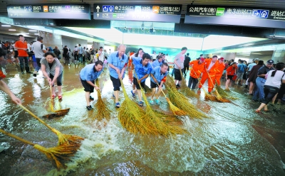 北京西站千人总动员 齐心协力退积水