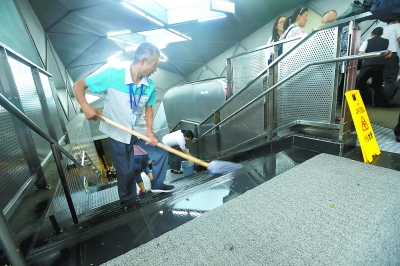 昨天,在地势较低的4号线陶然亭站西南出口,工作人员定点值守,及时清理楼梯上的残留雨水。本报记者 孙戉摄