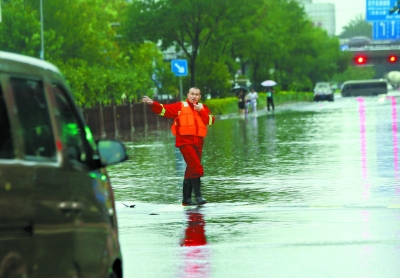 昨天,在程庄路积水路段,丰台水务应急抢险人员在齐腰深的水中徒手清除水中垃圾。本报记者 吴镝摄