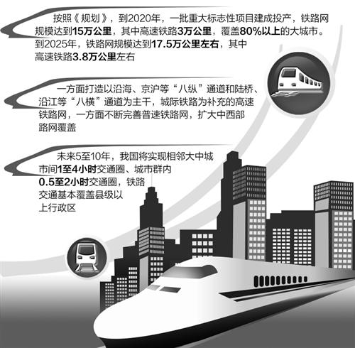 按照《规划》,到2020年,一批重大标志性项目建成投产,铁路网规模达到15万公里,其中高速铁路3万公里,覆盖80%以上的大城市,为完成“十三五”规划任务、实现全面建成小康社会目标提供有力支撑。到2025年,铁路网规模达到17.5万公里左右,其中高速铁路3.8万公里左右,网络覆盖进一步扩大,路网结构更加优化,骨干作用更加显著,更好发挥铁路对经济社会发展的保障作用。