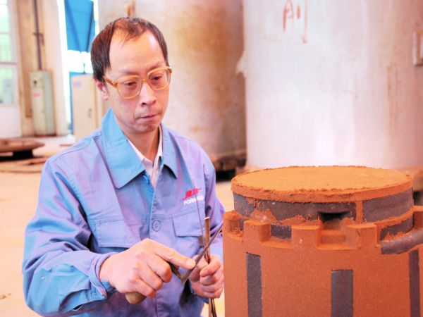 “国家级技能大师”“大国工匠”全国劳动模范毛腊生在雕刻铸造模型。