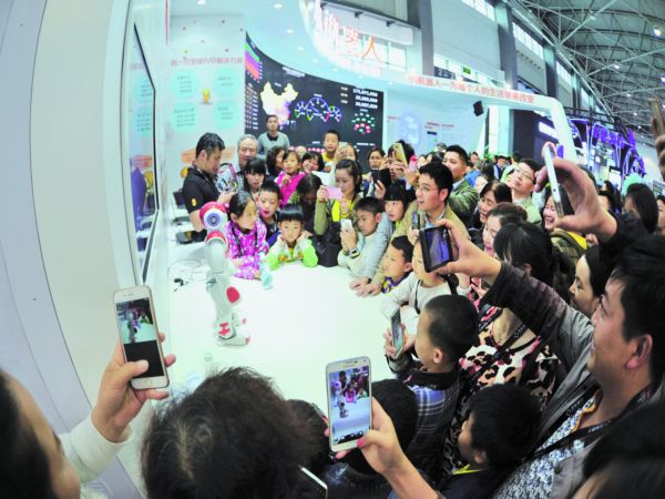 5月28日,在数博会小i机器人展区挤满了市民。芦晓娟摄