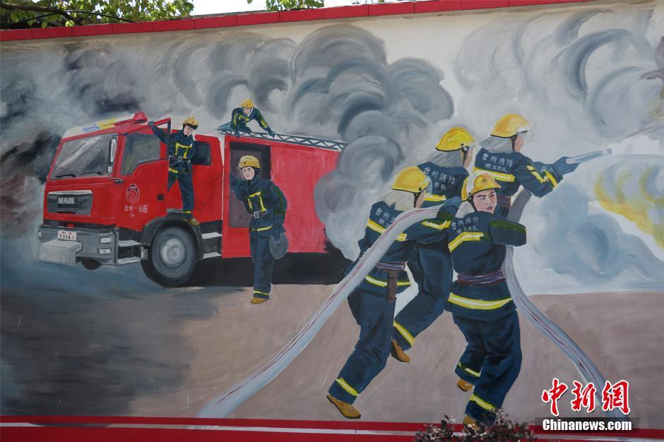 7月21日,在浙江省台州市仙居消防大队的文化墙上展示了发生火灾时,消防战士赶赴现场出水灭火的场景。据悉,这幅长72.6米,高2.1米的大型手绘文化墙是由多个场景构成,主要以消防官兵日常工作、生活、娱乐、训练等为背景,展现了消防官兵的成长历程和战斗风采。 中新社记者 何蒋勇 摄