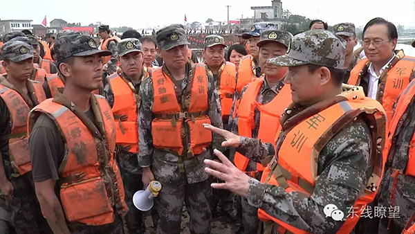 7月14日,望江县西联圩上,东部战区司令员刘粤军上将现场号令:“要发扬部队敢打硬仗的优良传统和顽强作风,守护堤坝安全,防范险情灾害,坚决完成党和人民交给的光荣任务!”