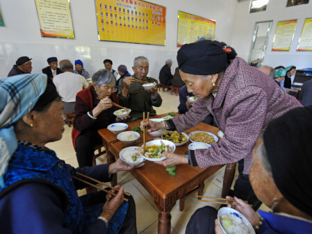 在云南省曲靖市麒麟区三宝街道兴龙村,老人们在养老服务点吃晚饭 周磊摄
