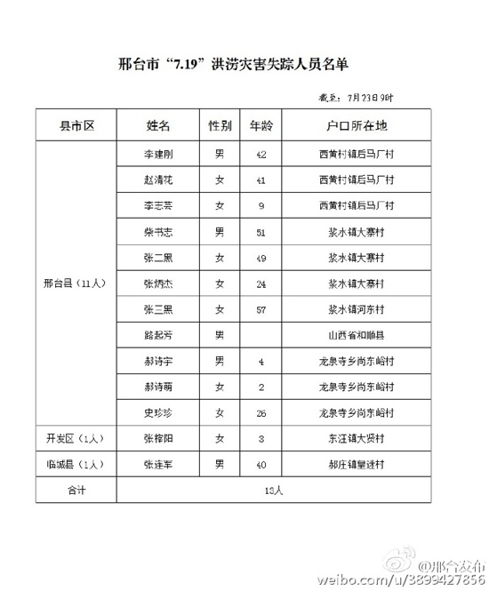 河北邢台公布洪灾遇难者及失踪人员名单
