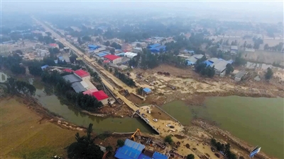 7月23日,邢台开发区大贤村村口,可以清楚看到七里河流到此处河道突然变窄。7月19日夜,七里河洪水漫过河堤决口,进入包括大贤村在内的12个村,夺走多条人命。邢台方面就七里河洪水问题进行了回应,官方认定为自然原因造成。新京报记者 朱自洁 摄