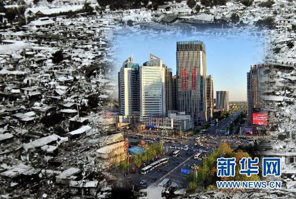 黑白照片:大地震后,唐山化为一片废墟(1976年7月28日,常青摄);彩色照片(中图):7月9日拍摄的唐山市城区。 新华社发