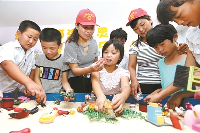 7月21日,志愿者与留守儿童利用心理沙盘做游戏进行心理辅导。当日,安徽省淮北市相山区渠沟镇妇联的志愿者,来到辖区张集村留守儿童活动室,为留守儿童讲解和发放暑期安全爱心小贴士,进行心理健康教育。万善朝 摄