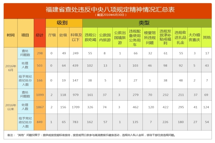 日前,福建省纪委发布2016年1至6月查处违反中央八项规定精神问题情况。上半年,福建共查处违反中央八项规定精神问题1099起、处理1867人,给予党纪政纪处分849人。