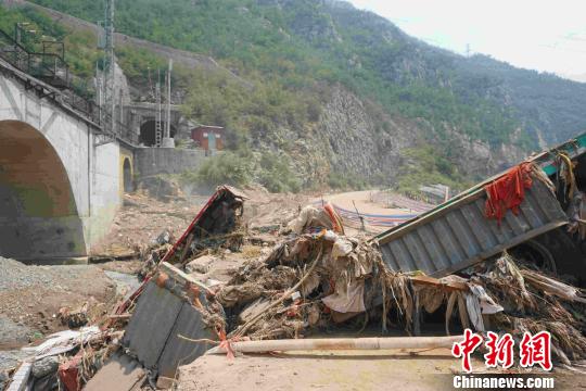 驱车驶往井陉县洪灾区,行驶至井陉县南峪镇北峪村,道路损毁越来越严重。洪水退去后充满碎石的河道,被抢险人员临时开辟出了一条小路,车辆行驶速度还不如步行快。靠近河道的房屋有的已经完全倒塌,有的墙壁被冲走。在残垣断壁中间,不时能看到被绞成麻花状的机动车。在一座铁路桥下,3辆残破的大型货车坠落在深坑中,车头被泥沙掩埋。