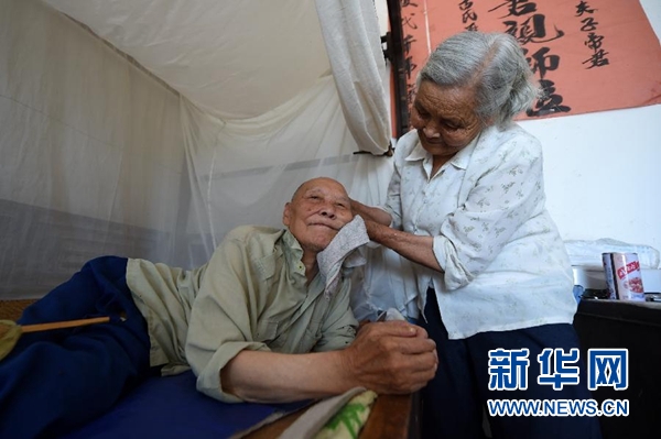 重庆忠县双桂镇石宝村家中,何光英在为丈夫古臣坤洗脸(7月27日摄)。新华社记者 唐奕 摄