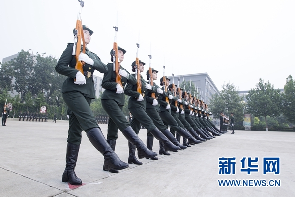 7月29日,中国人民解放军陆海空三军仪仗队队员在驻地训练。 新华社记者 陈益宸 摄