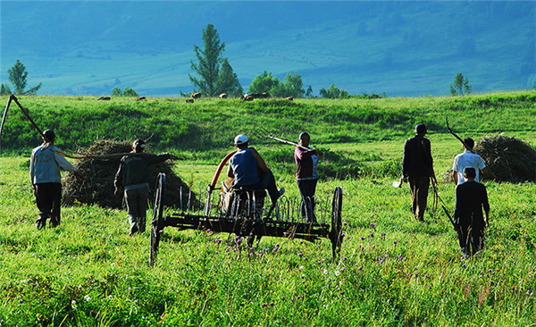 打草是哈萨克民族传统的生产项目,每年7月底8月初,草原上的牧民都开始忙着打草,为冬季牲畜饲草料做准备。