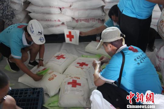 河北省红十字会组织志愿者整理救灾物资 将发往灾区