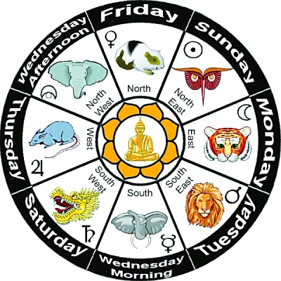 如此,缅甸的一周就被分为了八个单位,分别对应缅甸属相文化中的八种动物。这八种属相从周日到周六依次为:妙翅鸟、老虎、狮子、双牙象、无牙象、鼠、天竺鼠以及龙(娜迦),每一种属相主宰一颗星球及一个方向,每一种属相都有其独特的性格特点,八种属相构成的性格林林总总,异彩纷呈。
