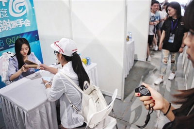因为需要“握手”,所以会场还特别配备了消毒员,每个粉丝进来握手之前,都由消毒员给粉丝的双手进行消毒处理。
