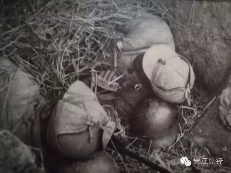 战士们在战壕里以草御寒