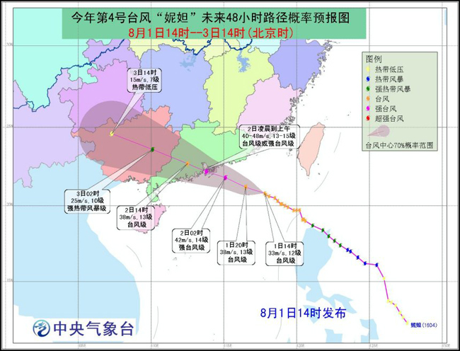 受“妮妲”影响,8月1日至3日,南海中部海域、广东西部沿海、海南东部沿海、北部湾、广西沿海和广西东部的部分地区都将有7~8级大风,阵风9~10级;南海北部海面、广东中东部沿海将有9~11级大风,“妮妲”中心经过的附近海面和地区风力12~15级,阵风可达16级。