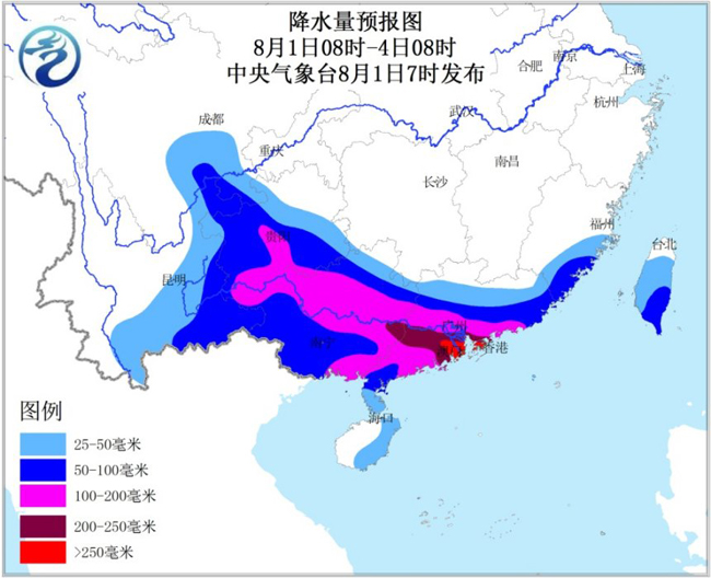 8月1日至4日,华南大部、贵州南部、云南东南部等地自东向西先后有暴雨到大暴雨,珠三角附近局地有特大暴雨,最大小时雨量有80~100毫米;过程累计雨量有80~180毫米;受台风结构影响,珠江口及以西、广西沿海降水较大,局地可达200~350毫米。