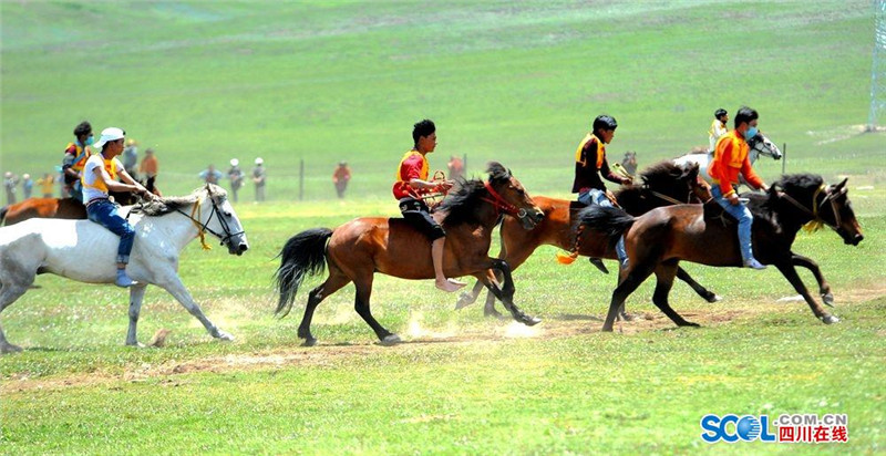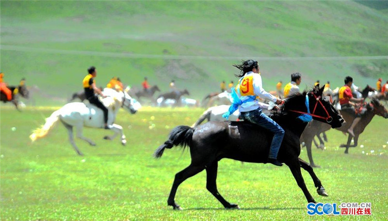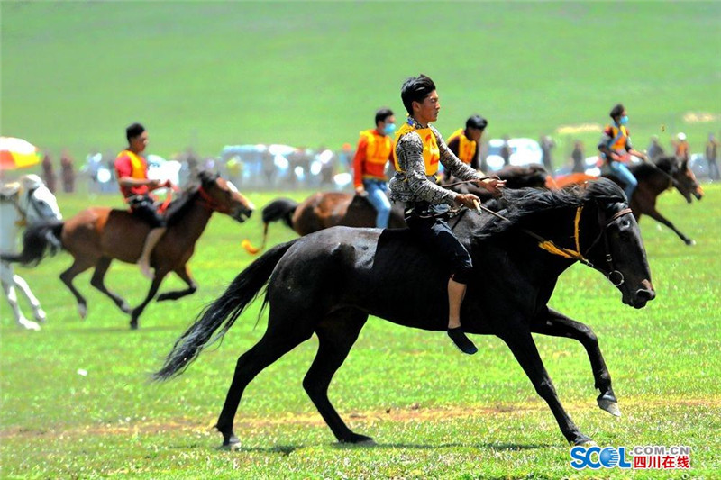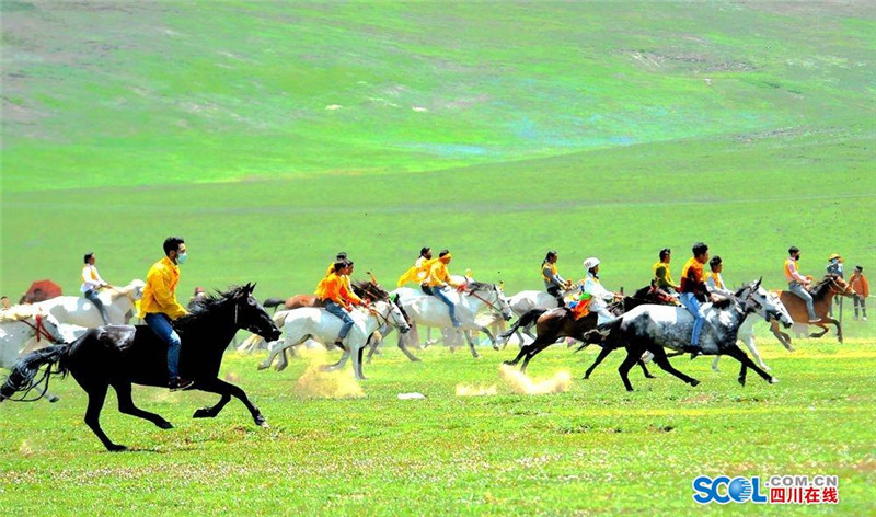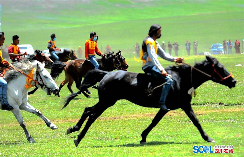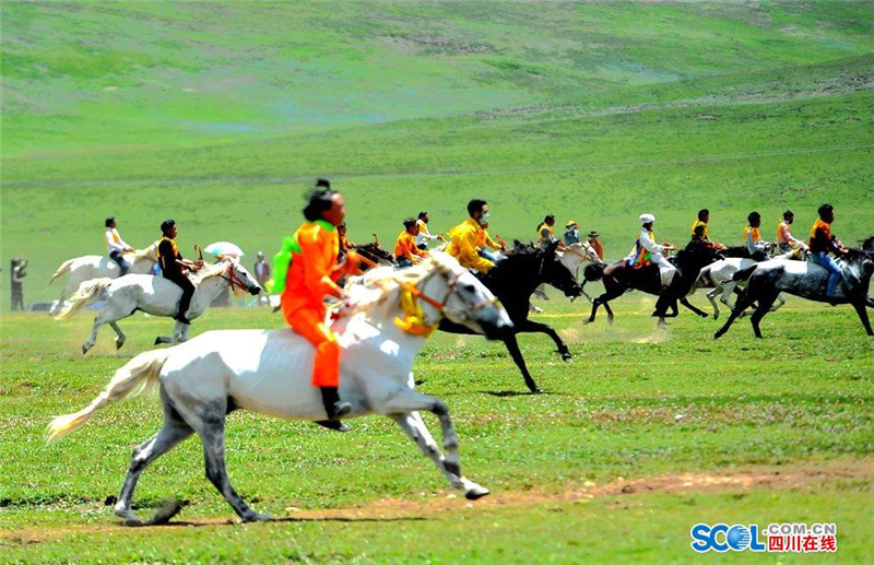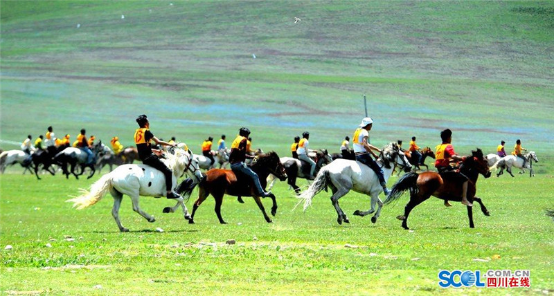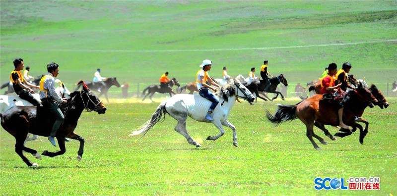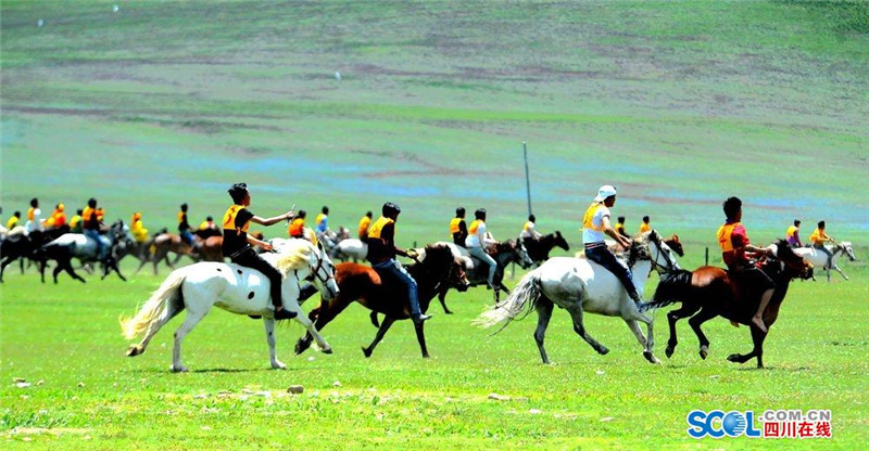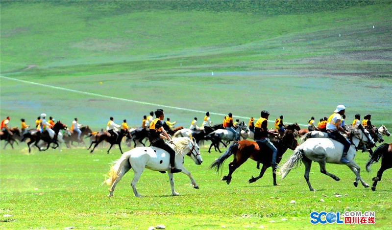 7月31日,2016中国.石渠帐篷节上赛马决赛在扎溪卡太阳部落赛场震撼开战。来自该县23个乡镇的骑手汇聚大草原蓄势而发。100余名选手们骑上骏马在碧绿蓝天白云的草原上奔驰。现场吸引了众多游客和当地群众观看比赛。(记者 衡昌辉 摄)