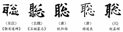 真所谓“你不说我倒还明白,你越说我越糊涂了”,导游认为“聪明泉”中的“聪明”二字写法极为独特,大有深意。黄庭坚故意将“聪”字的右边写成“上公下心”。其实在古代,这是一种很常见的写法,无需大惊小怪,请看下面的字例——(见图一)